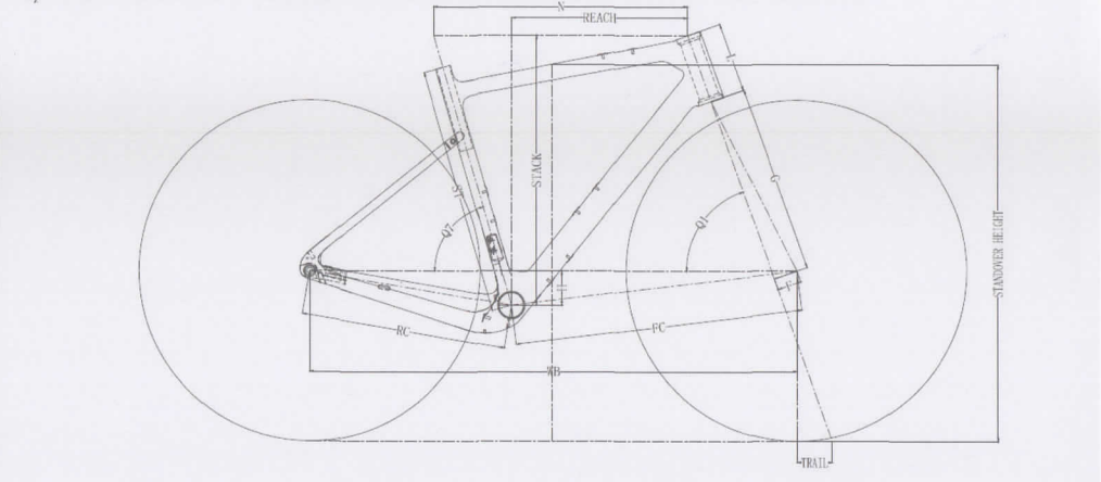 | SIZE | ST (mm) | N (mm) | RC (mm) | WB (mm) | L (mm) | FC (mm) | Q1 (°) | Q7 (°) | G | Stack Length (mm) | Reach (mm) | Trail (mm) |